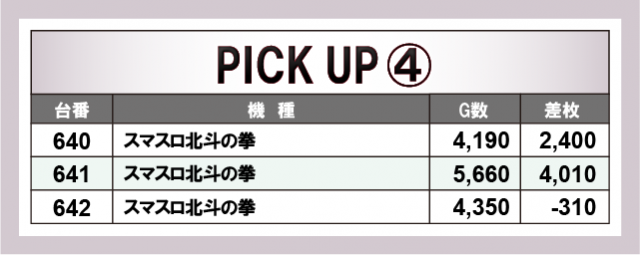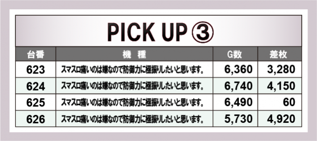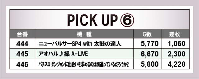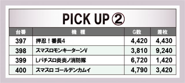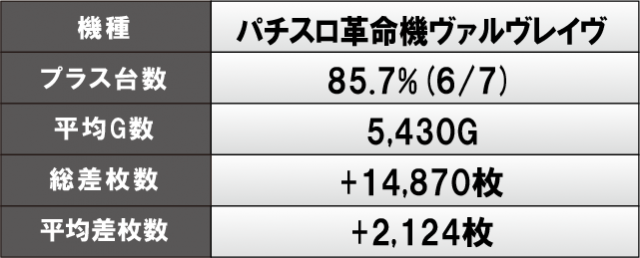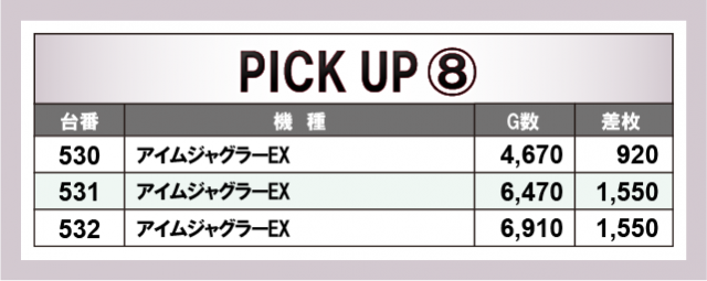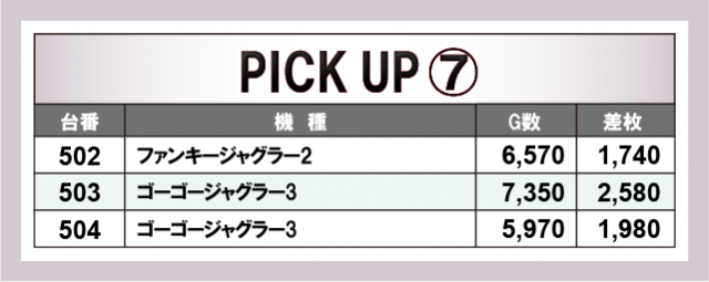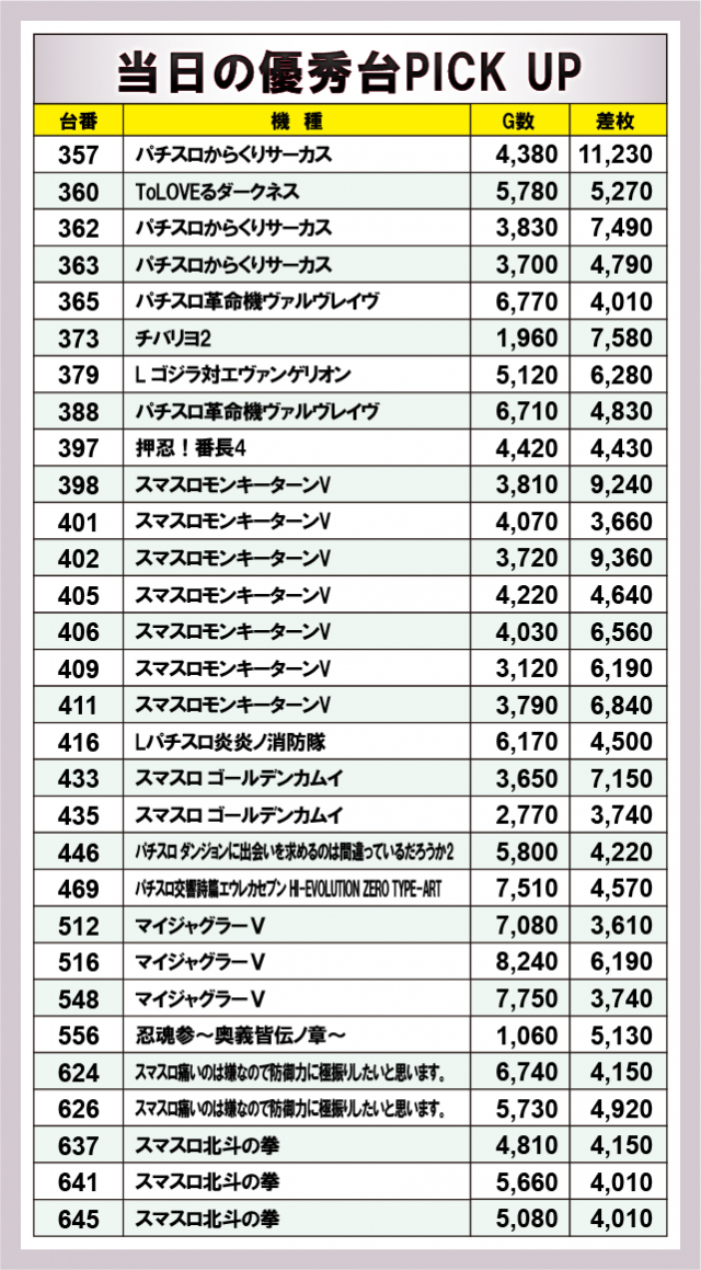 続いて、上表を見て分かる通り、人気機種を中心に横並び好況スポットが多数発生していたのが目に焼きつく。大きな熱量を放つ台も多く存在し、各機種に満遍なくチャンスが眠っていたようだ。また、回転数にしても手応えを感じていた様子が窺え、レバーを叩く力が強くなっていったのではないだろうか。