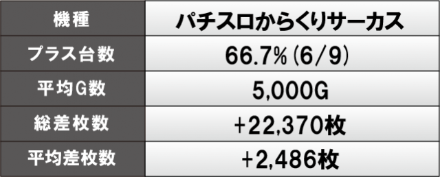 優秀台に目を通してみると、ピックアップ30台全てが+3,000枚OVERを記録!なかでも、『パチスロからくりサーカス』357番台+11,230枚で万枚OVERという鮮烈な記録を打ち立てた。そのほかにも、大台突破台が多数発生しており、遊技していたファンは相当な手ごたえを感じていたのではないだろうか。