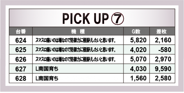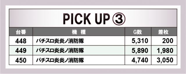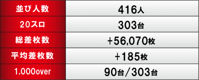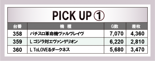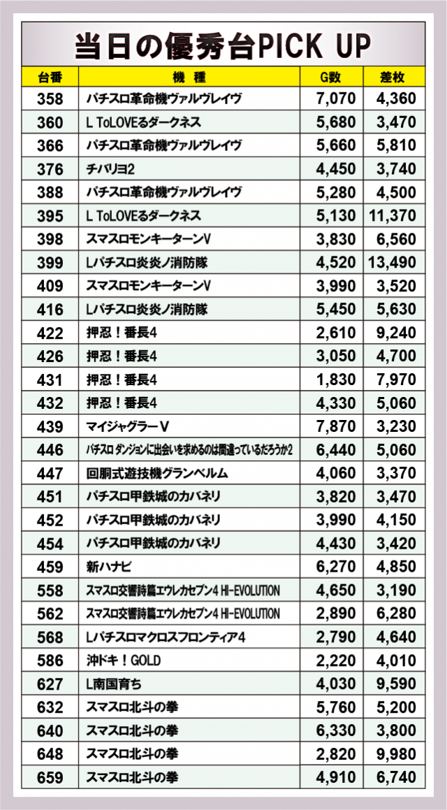 優秀台に目を通してみると、『Lパチスロ炎炎ノ消防隊』399番台+13,490枚・『L ToLOVEるダークネス』395番台+11,370枚と、ポテンシャルを秘めた台が順当に万枚OVERを達成。さらには『スマスロ北斗の拳』648番台+9,980枚・『L南国育ち』627番台+9,590枚・『押忍!番長4』422番台+9,240枚と万枚未遂も確認でき、店内の熱気は凄まじいものがあったと言える。
