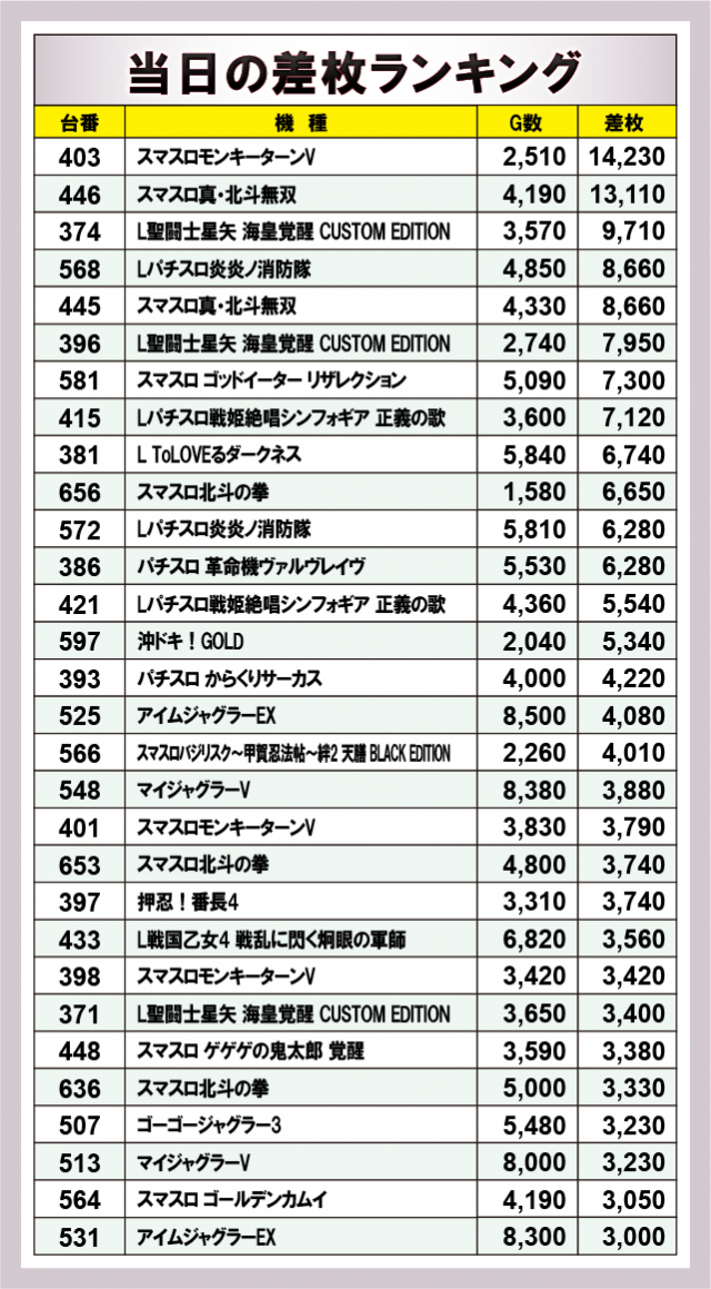 上表に取り上げた5機種は、いずれも店内を包み込む熱気を形成した機種と言える。スマスロを中心に万枚OVERや大台突破台が生まれているわけだが、『アイムジャグラーEX』『マイジャグラーⅤ』といった『ジャグラー』シリーズも負けず劣らず、+2,000枚OVERが多数発生する好成績をマークし、相当な手応えを感じていたのは間違いないだろう。
