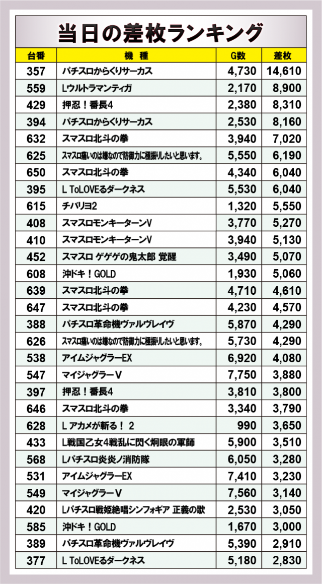 『パチスロからくりサーカス』にて万枚OVER、『Lウルトラマンティガ』『押忍!番長4』『スマスロ北斗の拳』から7~8,000枚OVERなど、スマスロを中心に各所で大台突破台が見られた。ファンはまとまった出玉を獲得し、恍惚の表情を覗かせていたのも見逃せないポイントだ。また、同時に『ジャグラー』シリーズも名を連ねており、スペック問わずあらゆる機種にチャンスが眠っていた様子が窺える。