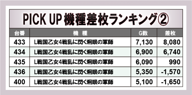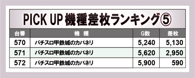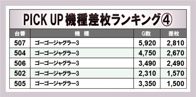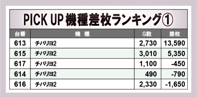 まずは差枚ランキングのチェックから。30台すべてが+2,000枚OVERで、+3,000枚OVERは21台出現。 それらのなかでもっとも優秀だったのは、613番台の『チバリヨ2』で、+13,590枚を獲得! またランクイン機種全体をみると、スマスロが大半を占めるなか『ジャグラー』シリーズも複数ランクインしており、 ファンに人気のある機種を中心にチャンスが隠されていたようだ!