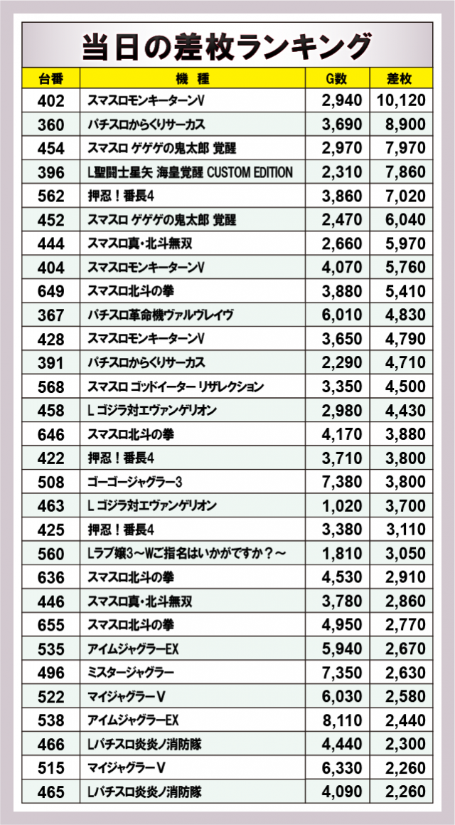 上表の通り、『スマスロモンキーターンV』から万枚OVERが発生。その他、『パチスロからくりサーカス』から+8,000枚OVER、『スマスロ ゲゲゲの鬼太郎 覚醒』『L聖闘士星矢 海皇覚醒 CUSTOM EDITION』『押忍!番長4』から+7,000枚OVERを記録するなど、各所で打ちごたえのある状況が整っていたことが窺える。
