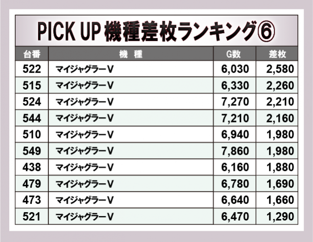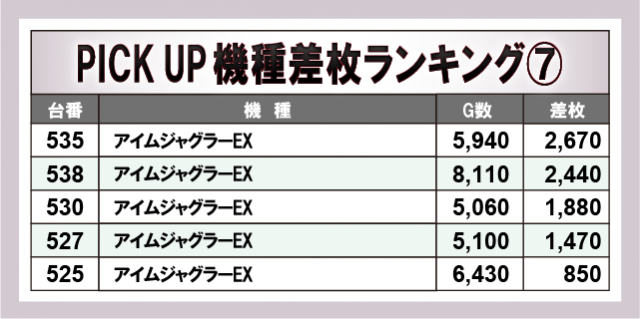 上表の機種はポテンシャルの高さを秘めており、万枚OVERを達成した『スマスロモンキーターンV』を筆頭にいずれの台もコンスタントに大当りを積み重ね、右肩上がりのグラフを描いていたのは何よりも好感を覚えるポイントだ。また、スマスロ機だけでなく『ジャグラー』シリーズも奮闘しており、4桁プラス台を多数輩出していたことから、あらゆる機種にチャンスが隠されていたようだ。