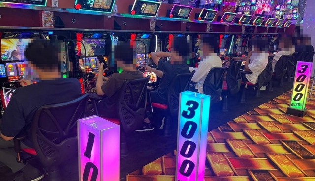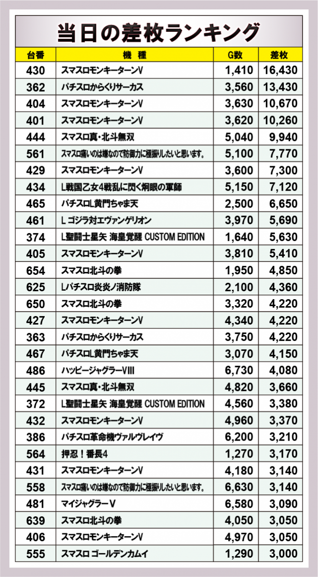 今回も当然のように万枚OVERが発生しており、その数は4台となっている。そのうち3台が『スマスロモンキーターンV』で、万枚台以外にも多数ランクインしており一際目立つエリアとなっていたのが見てとれる。さらに『スマスロ真・北斗無双』で万枚未遂台、『スマスロ痛いのは嫌なので防御力に極振りしたいと思います。』『L戦国乙女4戦乱に閃く炯眼の軍師』から+7千枚OVERが発生するなど、まとまった出玉を獲得する台の多さにファンも歓喜したはずだ。