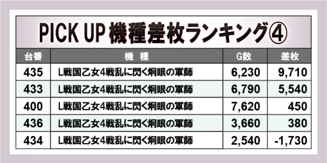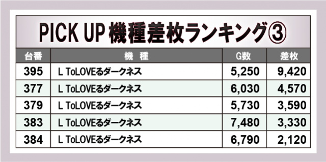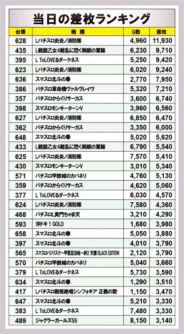 上表の5機種はいずれも高いポテンシャルを秘めており、それは大きなマイナスが少ない点から窺えるだろう。なかでも『Lパチスロ炎炎ノ消防隊』の万枚OVERを筆頭に『スマスロ北斗の拳』『L ToLOVEるダークネス』といった人気機種たちから、まとまった出玉獲得台が多数出現しており、右肩上がりのグラフを形成していた様子が目で見て取れる。各所で熱気を放つ台を多く確認でき、充実度の高いエリアとなっていたことは間違いなさそうだ。