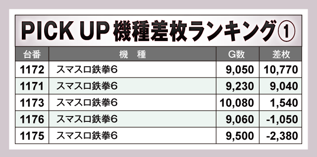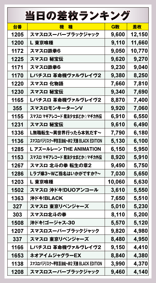 『スマスロスーパーブラックジャック』の+12,150枚をはじめ、『L 東京喰種』『スマスロ鉄拳6』の計3機種から万枚突破台が誕生!4位の『スマスロ 秘宝伝』も+9,000枚を超える好成績を記録したほか、ランクインした30台が+4,000枚を超えるハイレベルな結果を残した。また、ランクインした機種ラインナップはバラエティに富んでおり、どの機種からでも好結果を狙えた様子がうかがえる。特に『スマスロ鉄拳6』『スマスロ 秘宝伝』『スマスロスーパーブラックジャック』では、各台が終日非常に高い稼働を誇り、大きな勝利を手にするプレイヤーが続出した。今回も多くのプレイヤーが充実の1日を過ごした「虎視眈々取材」、次回以降の開催にも期待しよう。