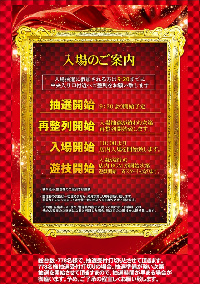 9:00より抽選受付を開始します。9:30迄に受付登録のほどよろしくお願いいたします。詳細は店舖最新情報をご確認ください。 |
