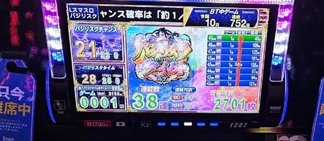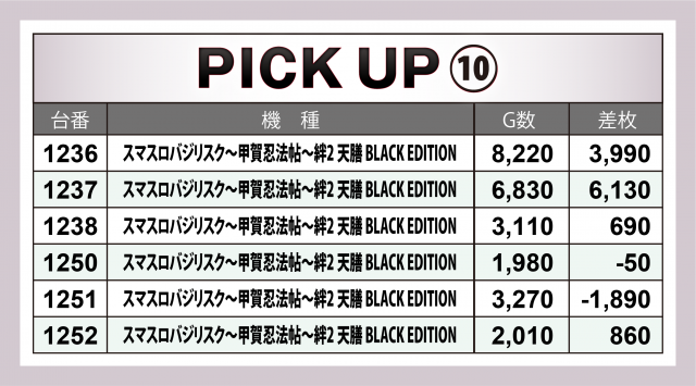 この中では『ヴァルヴレイヴ』『パチスロ からくりサーカス』が万枚以上の出玉を成し遂げ、『炎炎ノ消防隊』が+9千1百枚弱、『スマスロ バイオハザード:ヴェンデッタ』が+8千枚超、『スマスロバジリスク~甲賀忍法帖~絆2 天膳 BLACK EDITION』が+6千1百枚超、『スマスロモンキーターンⅤ』では+5千7百枚弱&+4千枚超が1台ずつと、それぞれに好成績が相次いだ。