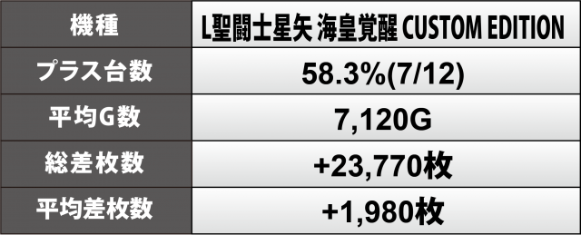 目が離せなかったのは『L聖闘士星矢 海皇覚醒 CUSTOM EDITION』12台。万枚を超えたのが2台に加え+7千6百枚弱が1台、その累計は+2万4千枚弱となった。