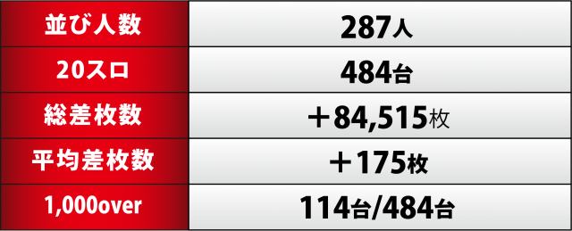 冒頭で示した通り、21.739スロ全484台の差枚数総計では+84,515枚と、同店取材の最高値を叩き出して終えることができた。