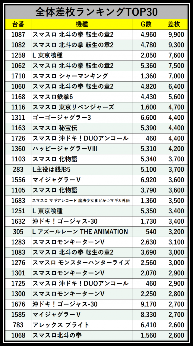 今回の「極誓取材」は、時間の経過とともに稼働が一層高まり、ホール内では熱気が持続。差枚ランキング上位には『スマスロ 北斗の拳 転生の章2』を筆頭に、機種単位で複数台が好結果を残す構成が目立った。加えて、少数設置機種や沖スロ、ノーマルタイプまで幅広く差枚が伸びており、立ち回り次第で狙いどころを広げられる状況だったと言えそうだ。次回も今回同様、いやそれ以上の盛り上がりに期待できるため、引き続き同店の動向や情報を随一チェックすることをオススメするぞ!