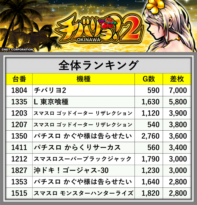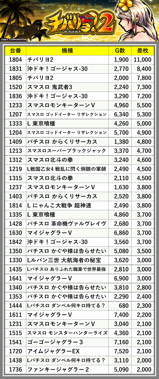厳選された取材対象機種をはじめ、その他スロット全体から好記録が飛び出した!プレイヤーが楽しんだ1日を下記データにて振り返ってみて欲しい。