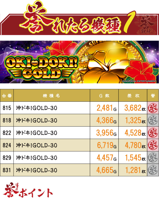 計25台もの台数が設置されているだけあって、この日も『沖ドキ!GOLD-30』コーナーはなかなかの盛況ぶり。常にシマ内のどこかでハイビスカスが輝いており、赤誉マークが3台も出現するほど盛り上がりを見せていた。