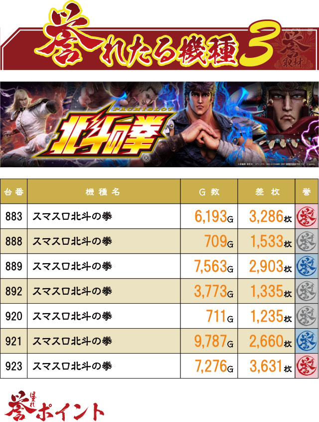 取材班の予想通り、やはり今回も『スマスロ北斗の拳』コーナーに複数の誉マークが出現。前回(5/1)よりも誉マーキングは多く、もしかしたら前回以上に好環境だったのかもしれない。