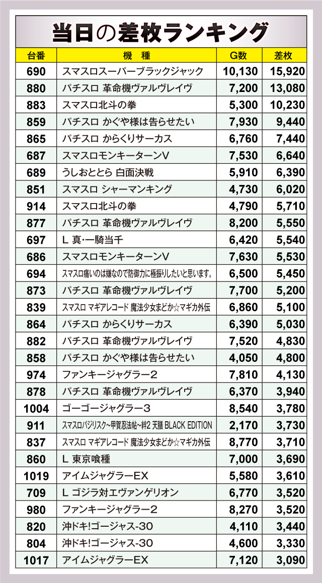 この日、最もプレイヤーの注目を集めたのが『スマスロスーパーブラックジャック』で、怒涛の+15,920枚を記録しランキングトップに。続く『パチスロ 革命機ヴァルヴレイヴ』と『スマスロ北斗の拳』も万枚超を達成しており、ランキングベスト3が実にハイレベルな結果を残し店内を盛り上げていた。