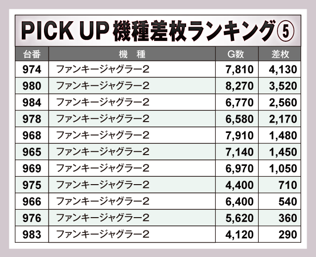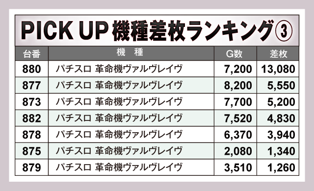 今回のPICK UP機種は全5機種。それぞれの機種でハイスコアが多数確認されているが、特に目立っていたのが『パチスロ 革命機ヴァルヴレイヴ』。前述の万枚超以外に+5,000枚超が2台も発生する勢いを見せていた。また、全ての機種で半数以上の台がプラス差枚となっているだけに、ファンにとって充実の一日になったのは間違いないだろう。