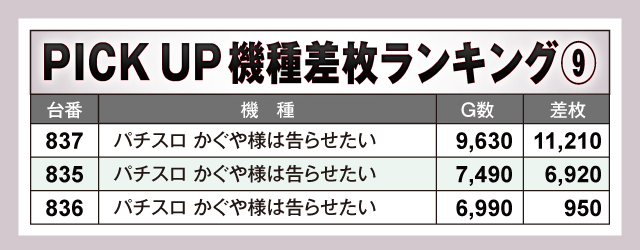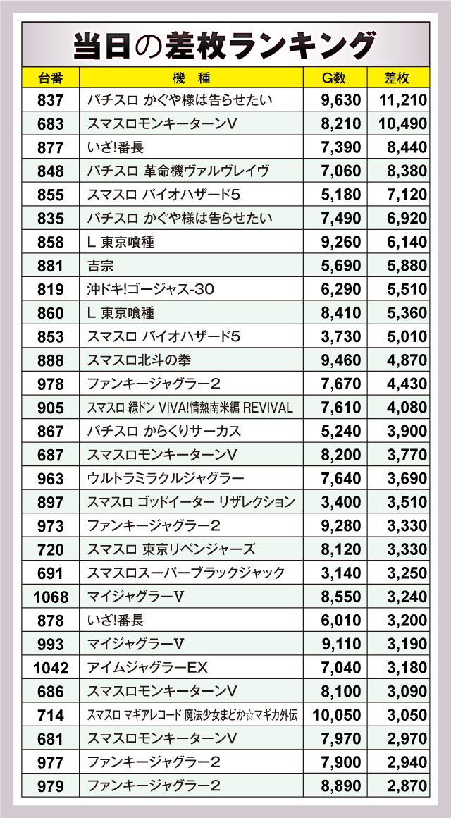 この日、最もプレイヤーの注目を集めたのが『パチスロ かぐや様は告らせたい』で、837番台が+11,210枚を叩き出しランキングトップに。続く『スマスロモンキーターンV』も万枚超を達成、さらに『いざ!番長』と『パチスロ 革命機ヴァルヴレイヴ』から+8,000枚超が飛び出すなど、人気のスマスロを中心にハイスコアが続出している。
