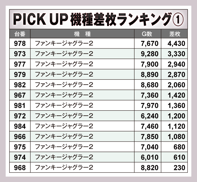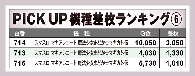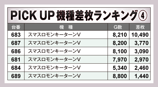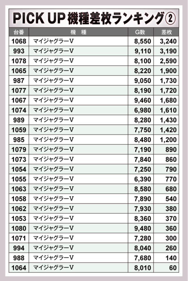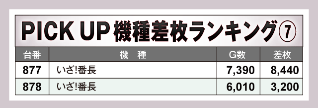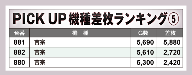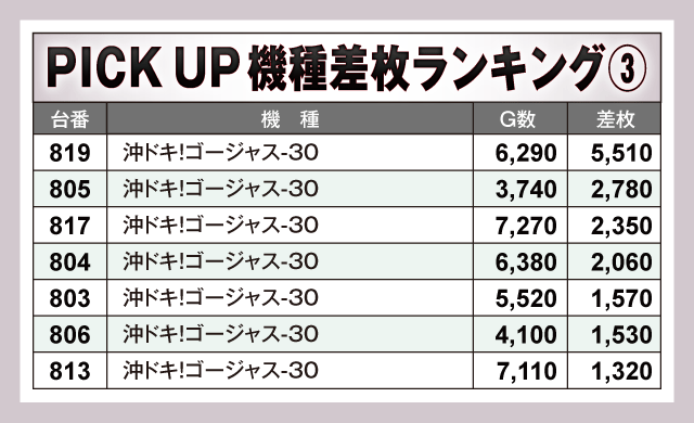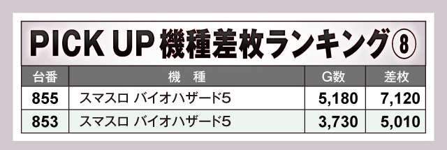 続いてPICK UP機種の状況をチェック!! ランキング上位台以外からも多数の好調台が確認されており、『スマスロ バイオハザード5』からは+7,120枚、『沖ドキ!ゴージャス-30』と『吉宗』からは+5,000枚超といったハイスコアが発生。また、2つのジャグラーシリーズは両機種とも半数以上の台がプラス差枚で実戦を終える見事な結果を残しファンを喜ばせていた。
