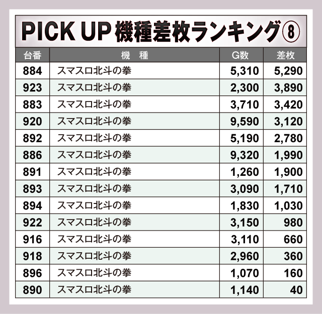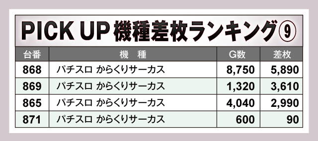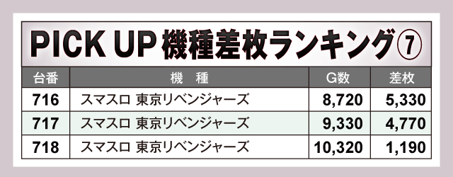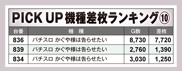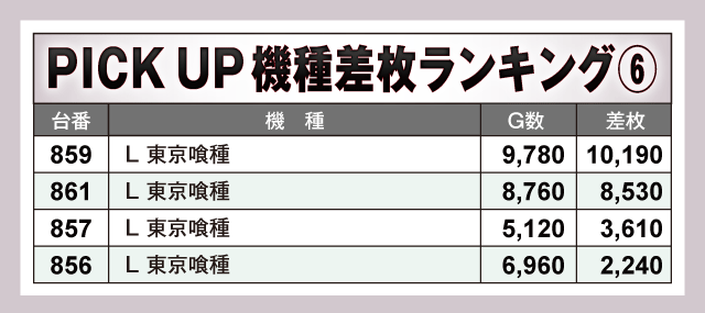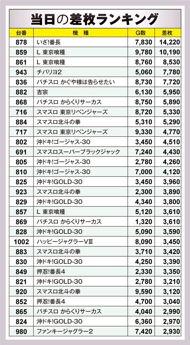 この日は、人気のスマスロを中心に多数の好調台を確認。そんな中、『いざ!番長』が圧巻の+14,220枚を叩き出しランキングトップに輝いた。続く『L 東京喰種』からは+10,190枚に+8,530枚といったハイスコアが連発。さらに、『チバリヨ2』と『パチスロ かぐや様は告らせたい』が+7,000枚超を記録している。