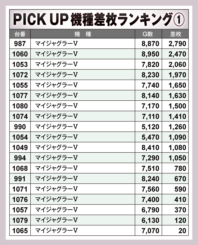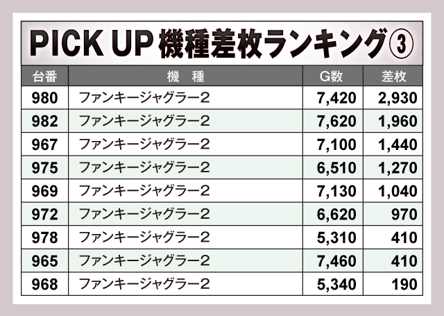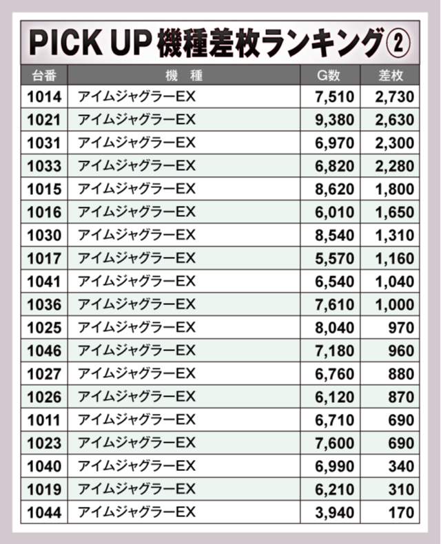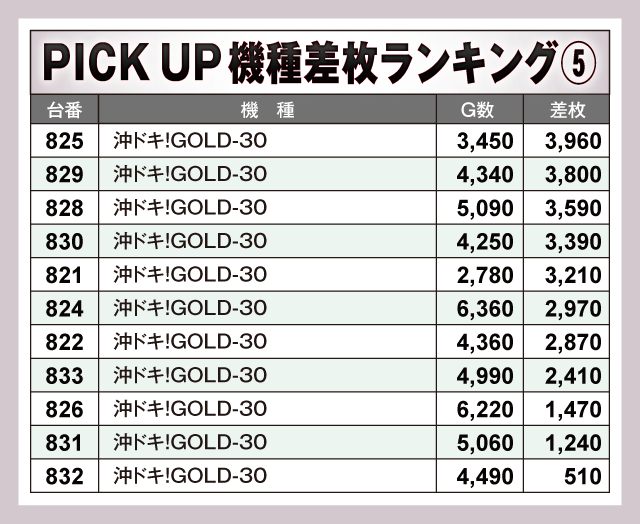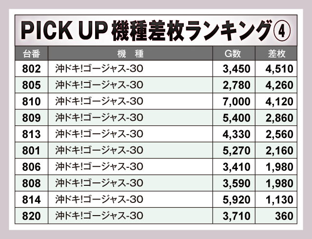 続いてPICK UP機種の状況をチェック!! ジャグラーシリーズの中で特に目立っていたのが『アイムジャグラーEX』で+2,000枚超が4台も発生。また、沖ドキ!シリーズも大奮闘しており、『沖ドキ!ゴージャス-30』は+4,000枚超が3台、『沖ドキ!GOLD-30』は+3,000枚超が5台も確認されている。