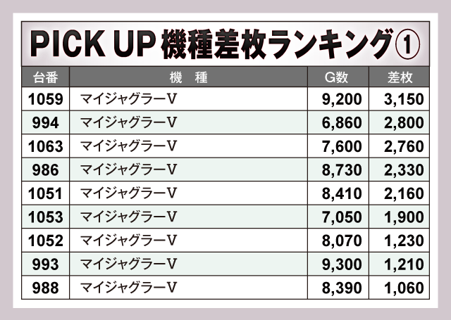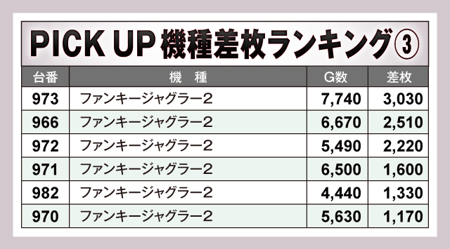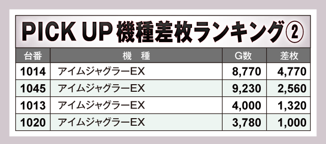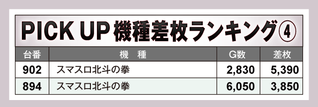 今回のPICK UP機種は全9機種で、差枚上位にランクインした台以外からも多数の好調台を確認。人気の『スマスロ北斗の拳』と『スマスロ 北斗の拳 転生の章2』は、両機種ともに+5,000枚超が発生している。また、3つのジャグラーシリーズはプラス差枚で実戦を終えた台が続出しファンをよろこばせていた。
