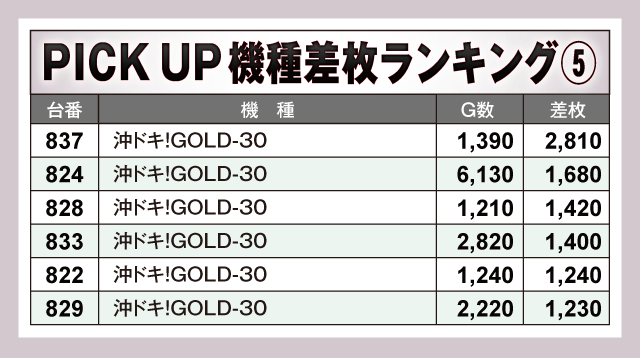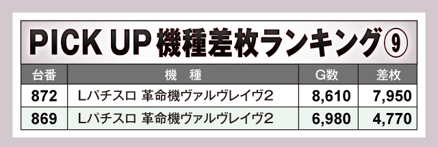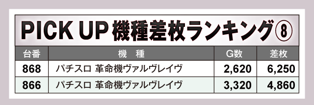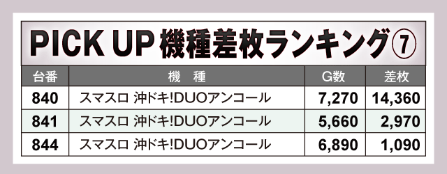 この日、最もプレイヤーの注目を集めたのが『スマスロ 沖ドキ!DUOアンコール』で、840番台が圧巻の+14,360枚を叩き出しランキングトップに。続く『スマスロ 新鬼武者3』も万枚超、『Lパチスロ 革命機ヴァルヴレイヴ2』が+7,950枚、『パチスロ 革命機ヴァルヴレイヴ』が+6,250枚を記録するなど、新旧を問わず様々な機種からハイスコアが飛び出している。