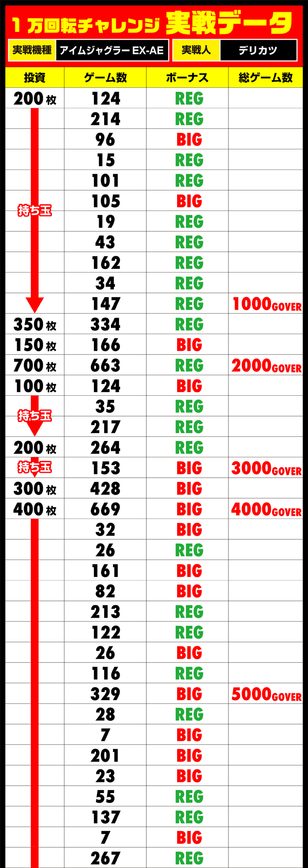 1000G到達までにREGを8回も獲得と、「アイムジャグラーEX-AE」でのチャレンジは成功に有利な展開。