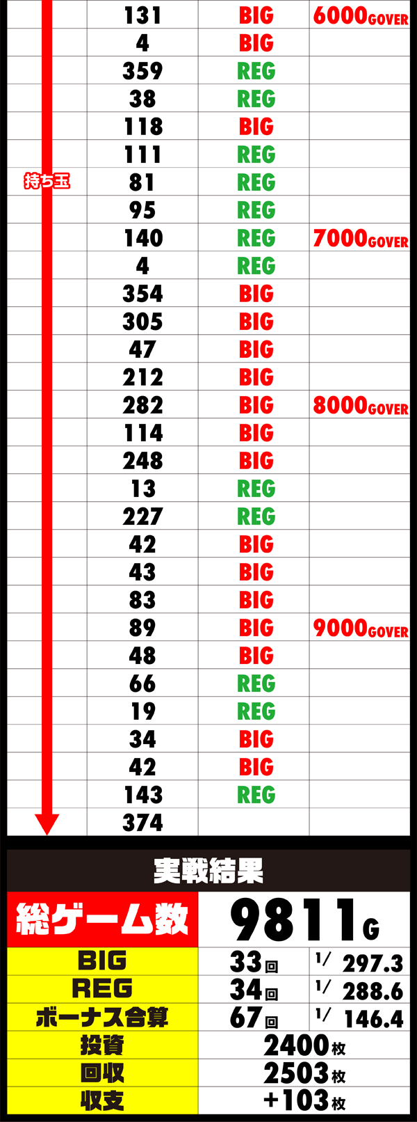 高設定といったボーナス合算確率になりながらもタイムロスは少なく、順調なペースを保っていた。