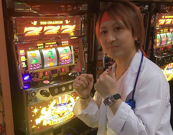 店内に入ると、さっそく「アイムジャグラーEX-AE」を実戦機種に決定。やる気に満ちたファイティングポーズをみる限り、1万回転も軽々とクリアしてくれそうだ。