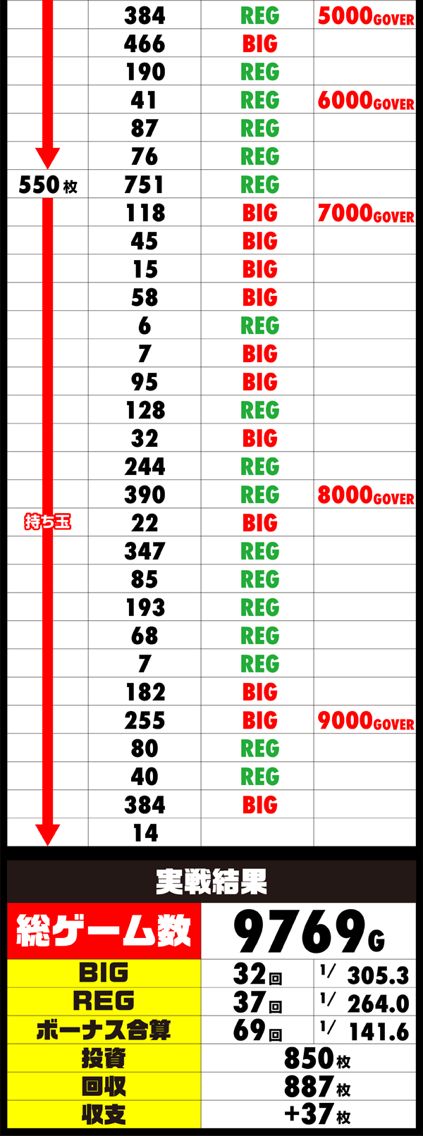 終盤に差し掛かると700G以上のハマりがあったことによって、一時的に消化スピードがアップ! 流れに乗り、最後は1万回転達成となれば良かったのだが…。