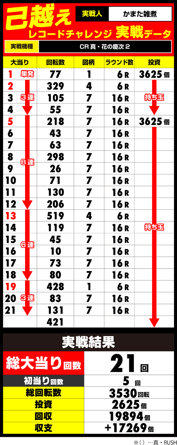 この日はすべての初当りでRUSHに突入と、ヒキの強さをみせたはずが…。結局は過去最高記録を破ることはできず。