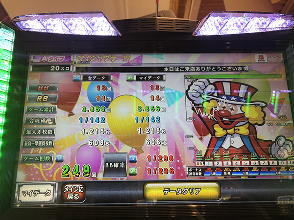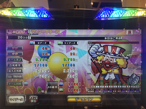 実戦機種に選んだのは「マイジャグラーⅣ」。1万回転達成とともに、たくさんのプレミア演出をみることを目標としつつチャレンジをスタートさせていた。