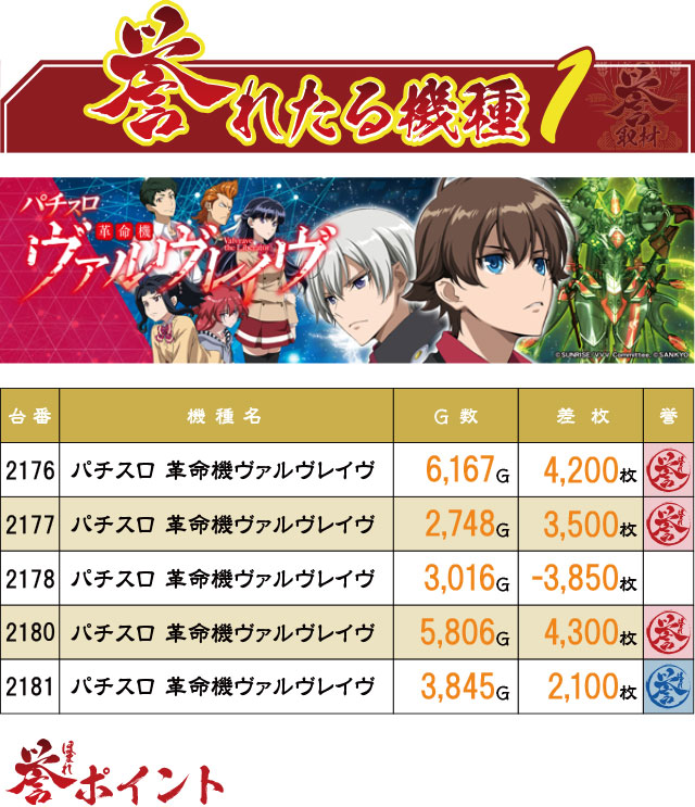 高いポテンシャルを有する『パチスロ 革命機ヴァルヴレイヴ』だけに、この日も赤誉マークを確認。ただし、前回は半数近い台に誉マーキングが付いていたが、今回はこの4台に留まってしまった。