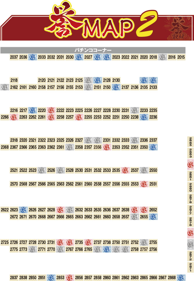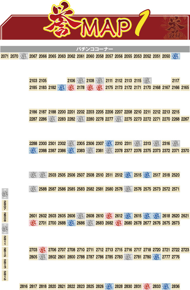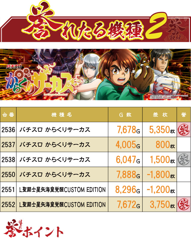 『パチスロ からくりサーカス』と『L聖闘士星矢海皇覚醒CUSTOM EDITION』が連なるこちらのブロックには、誉マーキングが3台。特に好調の兆しを見せていたのは『からくり』の2536番台で、安定した動きで+5,000枚を突破していた。