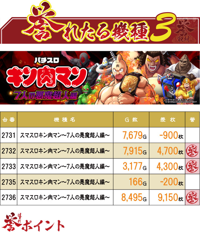 5台設置の『スマスロキン肉マン~7人の悪魔超人編~』は、全台系を思わせる堂々の結果を披露。2台がわずかなマイナスで終わってしまったが、その内の1台は明らかな総ゲーム数不足。プラスの3台は2台が+4,000枚超え、2736番台は+9,000枚超えを達成!