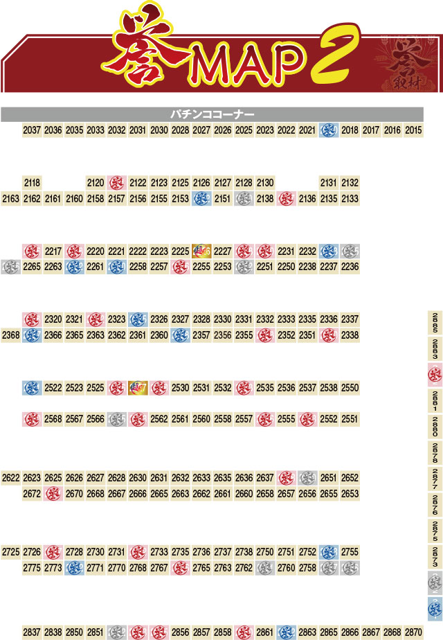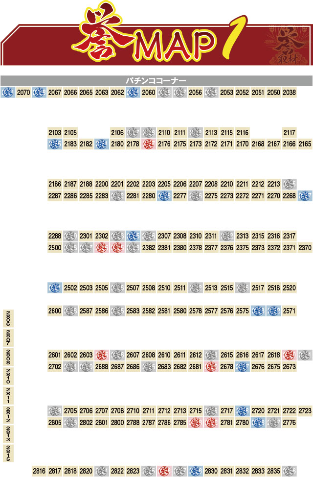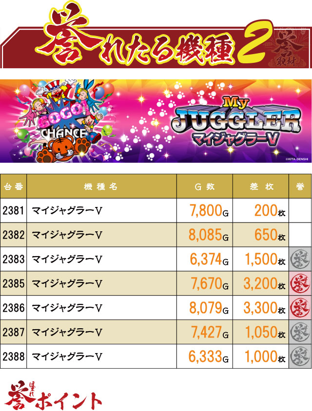 『マイジャグラーⅤ』コーナーでは、7台並んでプラっているゾーンを発見。特に2383~2388番台には5台連続で誉マークが付いており、内2台が赤誉マーキングだった。