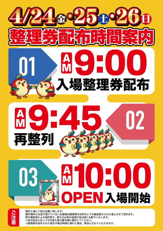 朝9:30より1階EVホールにて先着順で整理券を配布いたします。 |