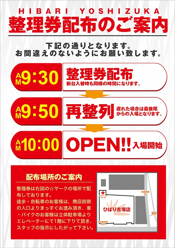 朝9:30より1階EVホールにて先着順で整理券を配布いたします。 |