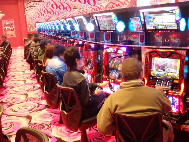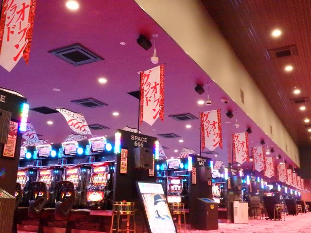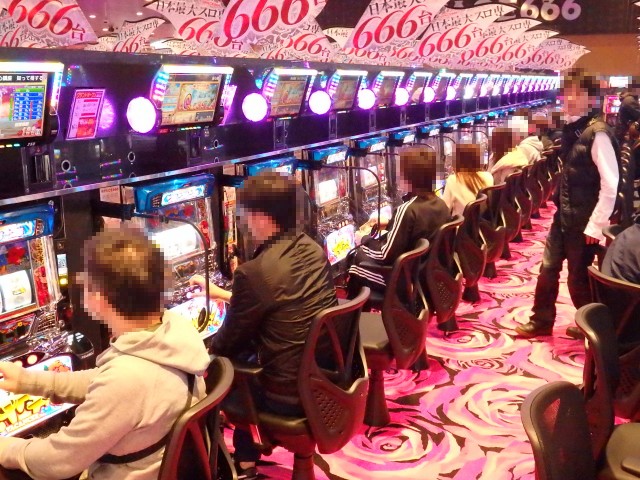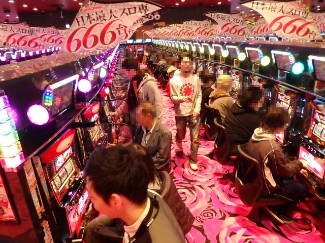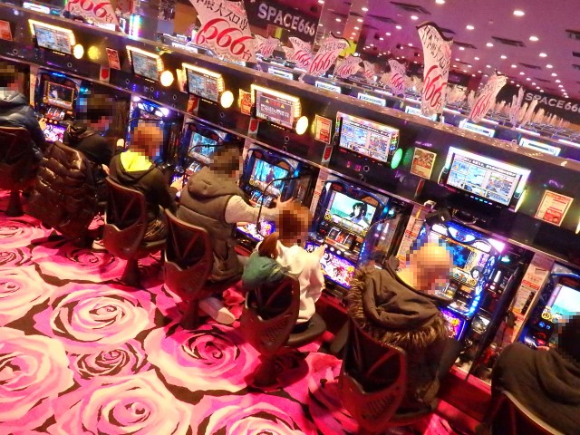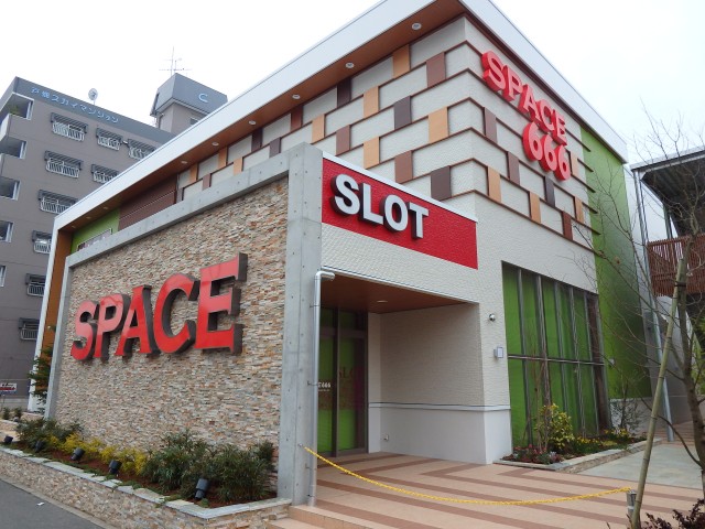 その名もスペース666!! 店名の由来は設置台数に因んでのものですが、何がスゴいってこのお店、パチスロ専門店なんですよ。666台がすべてパチスロとは、まさに日本最大級という謳い文句も決して大げさではありません!