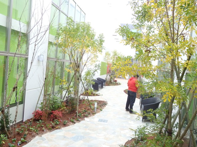 その他、これまたゆったりできそうな雰囲気の中庭があり、心も体も癒してくれます。また、清掃の行き届いたトイレは清潔感にあふれ、個室がそれぞれ違う壁紙になっていて、どこか高級感が漂います。そんな快適かつ満足度の高い設備が揃う中でも、「できるっ!」と思ったサービスがコレ!