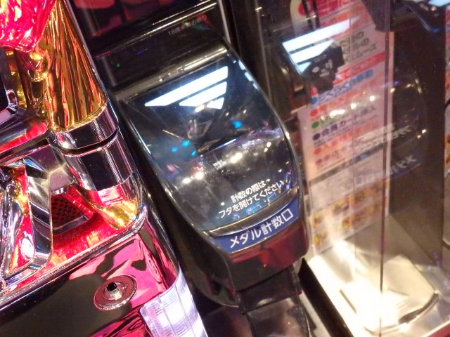一般的に、パチンコに比べるとパチスロではまだまだ設置の少ない各台計数機ですが、これは素晴らしい! 取材している身として正直に言えば、大事な別積みのドル箱を倒しちゃう心配がないのが何より助かります(笑)。
