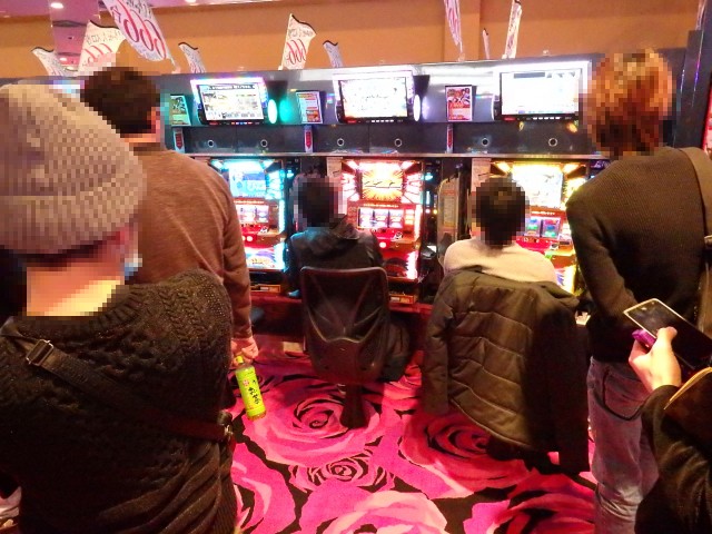 そのファンたちから、まず圧倒的な人気を集めたのが『バジリスク〜甲賀忍法帖〜絆』! 41台と大量導入ながら、瞬く間に席が埋まってしまいました。次いで人気だったのが『ジャグラー』シリーズで、『パチスロ北斗の拳 強敵』や『沖ドキ!』も実戦台を吟味する多くのファンで賑わっていました。