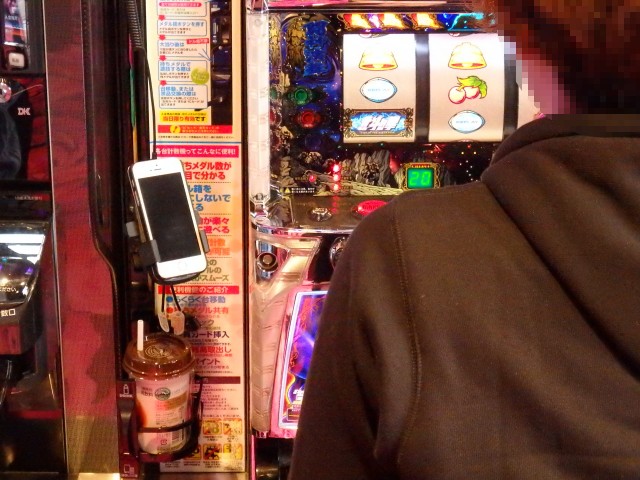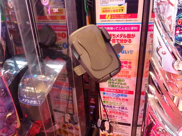 さらに、各台に付いているのは計数機だけじゃない! 実際使っているところを見て便利そうな印象を受けたのがスマホホルダー。自由に調節できるアームが付いてるので、遊技しながらでもベストアングルでスマホの操作ができます。しかも充電器まで備え付けられており、長時間遊技でも電池切れの心配は全くありません!