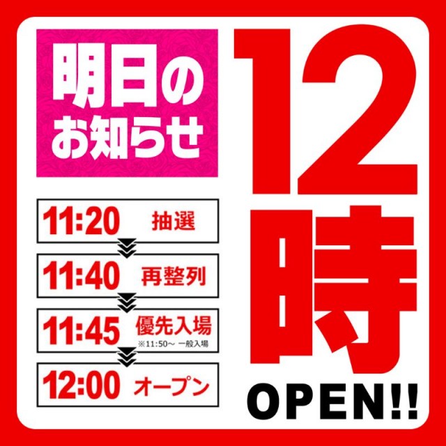 朝10時開店の場合、朝9時40分より入場抽選開始。抽選時間が変更の場合は、店内やHPでお知らせします。 |