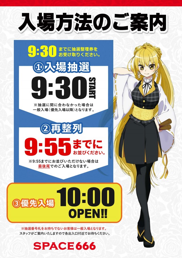 朝10時開店の場合、朝9時40分より入場抽選開始。抽選時間が変更の場合は、店内やHPでお知らせします。 |