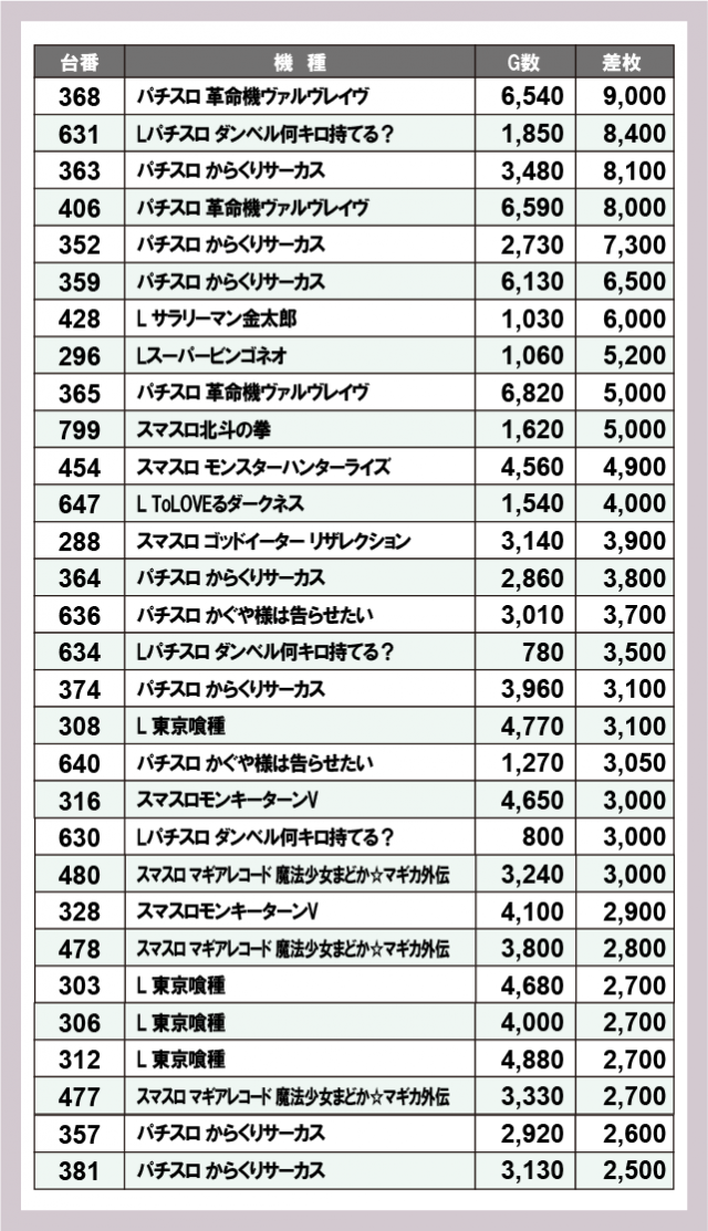 ※差枚数順に掲載しています