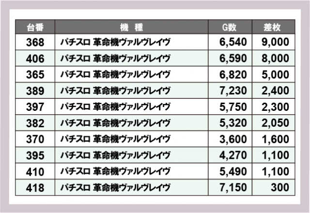 ヴァルヴレイヴ差枚ランキング