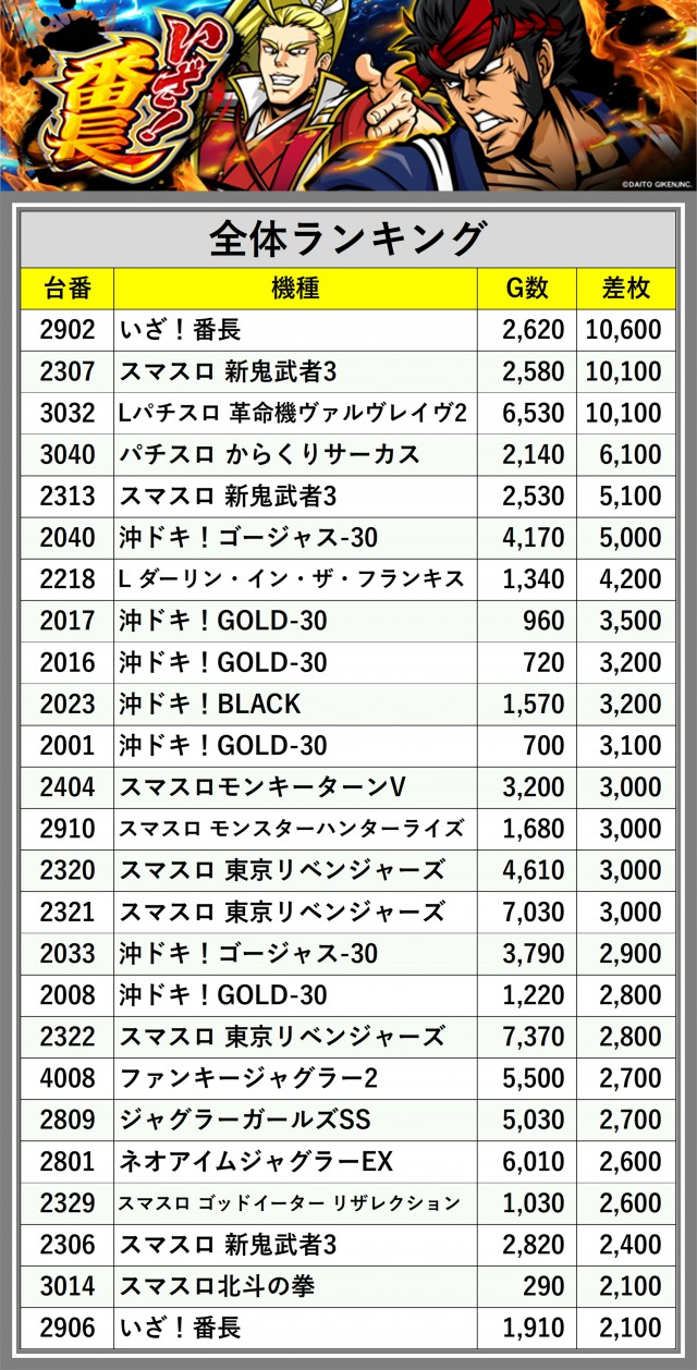 厳選された取材対象機種をはじめ、その他スロット全体から好記録が飛び出した!プレイヤーが楽しんだ1日を下記データにて振り返ってみて欲しい。