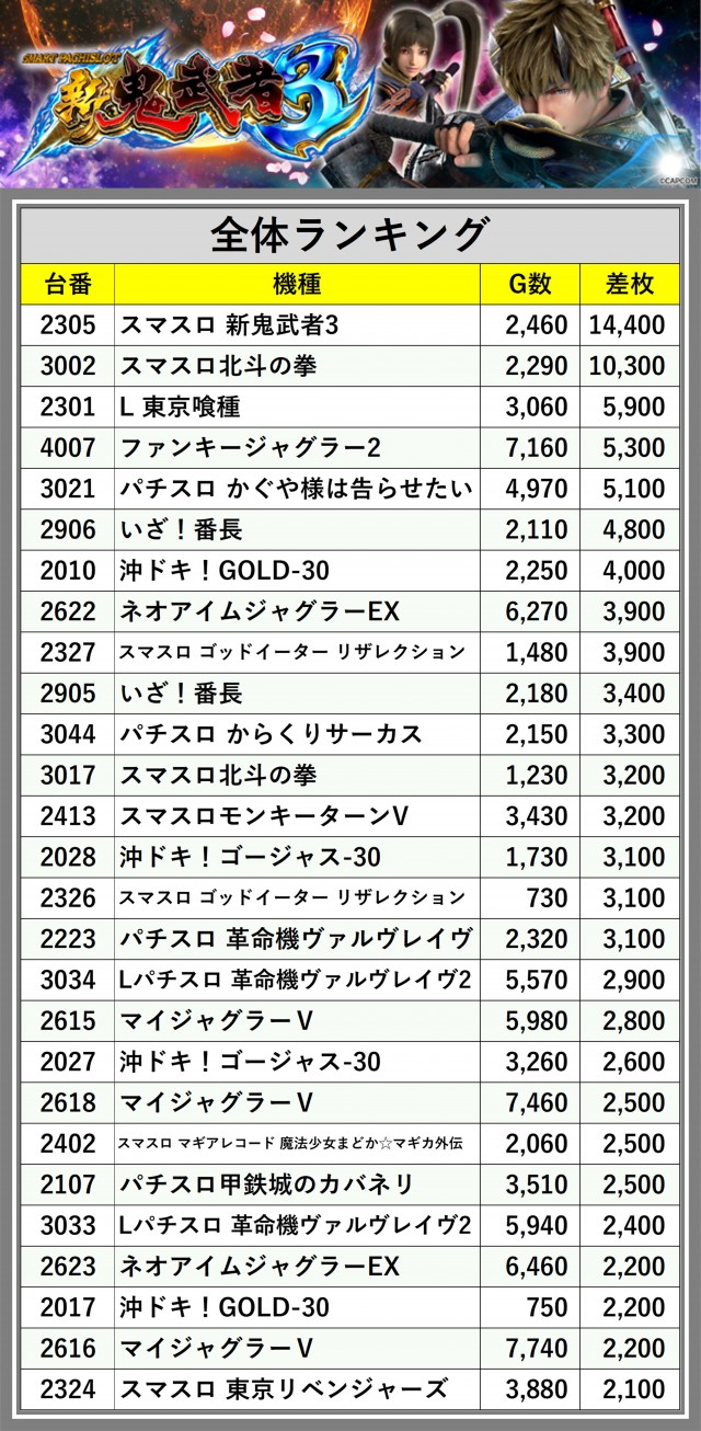 厳選された取材対象機種をはじめ、その他スロット全体から好記録が飛び出した!プレイヤーが楽しんだ1日を下記データにて振り返ってみて欲しい。